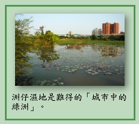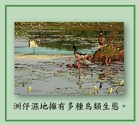 濕地是許多生物的家,但因為人類過度開發土地,佔據了生物的家,才造成物種漸漸滅絕消失。可是洲仔濕地在建設時,卻將以往公園開闢以「人」為主體的規劃形式,轉變成「生物」才是主角的規劃方式。在屢次探訪洲仔濕地過程中,我們看見這裡擁有紅冠水雞、小白鷺、蒼鷺、夜鷺、鴛鴦等水鳥,還有各式各樣的植物生態,這些動人的自然景觀,真是都市中難得一見,而這種都市公園新型態的革命,不僅帶來了豐富的生態與盎然的生機,也讓人類與大自然的距離更為接近。