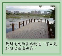 與前期既有濕地區隔,以增加生態、景觀多樣化,包含(1)翠鳥堤 與柳岸;(2)鴨堤、香蒲群落;(3)砂礫灘