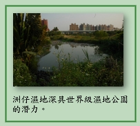 洲仔這個地方,本來是「民俗技藝園區」預定地,但台灣濕地保護聯盟(以下簡稱濕盟)向高雄市政府提出「水雉返鄉計畫」的構想,經過幾年溝通,取得洲仔社區居民的共識,終於完成洲仔濕地公園的建造。這次成功的經驗,可以說是重新賦予都會地區公園共生、永續經營觀念的最佳解釋,這也是洲仔濕地創造出來的極大附加價值。