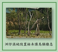 1.基地西邊廣設各種不同的植物,而形成密林生態 2.外側種有草本植物,而形成低莖草地環境,可提供鳥類棲息覓食和 繁殖的空間 3.靠近水岸處鋪設水鳥沙浴地,提供海岸水鳥棲息並進行沙浴所需之 地