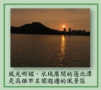 蓮池潭每天的晨昏,水霧濛濛,池畔景色秀麗,若隱若現,令人感到十分神秘。尤其是甘雨潤澤的夏季,潭水盈盈,波光粼粼,加上潭畔的垂柳搖曳,潭面的浮萍與水蓮隨著微風飄盪,畫面之美就像身處於仙境中。而湖畔龜山特殊造型與龍虎塔遠近倒映水中,以「蓮潭夕照」聞名。 |