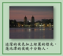近年來在市政府有計畫的建設下,蓮池潭有了另一個很美的名字∼「光之潭」,到了夜晚,迷濛的夜色加上炫麗的燈光,更增添蓮池潭無限動人的風情。